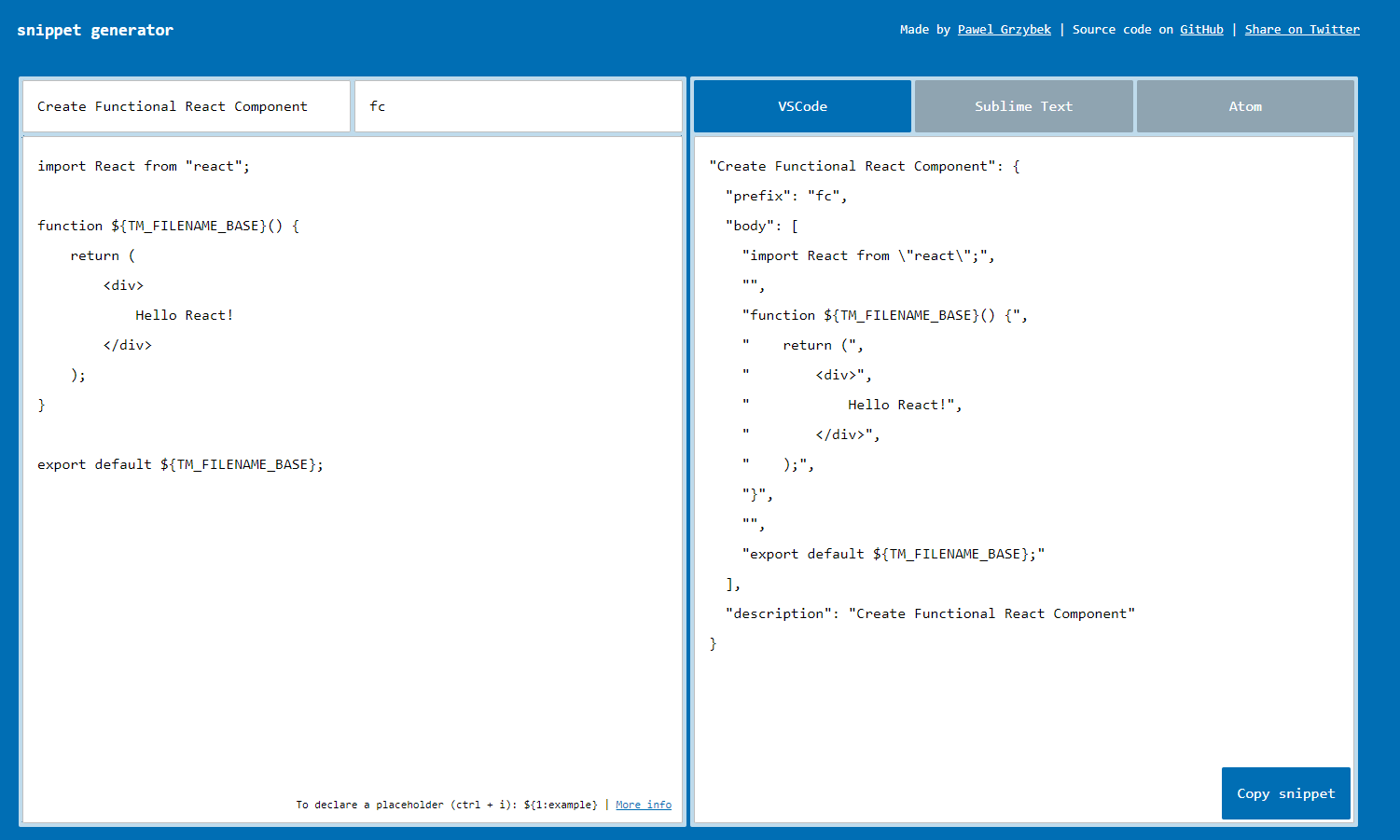 ${1:Hello React!} 처럼 ${1:}로 감싸주면 된다.